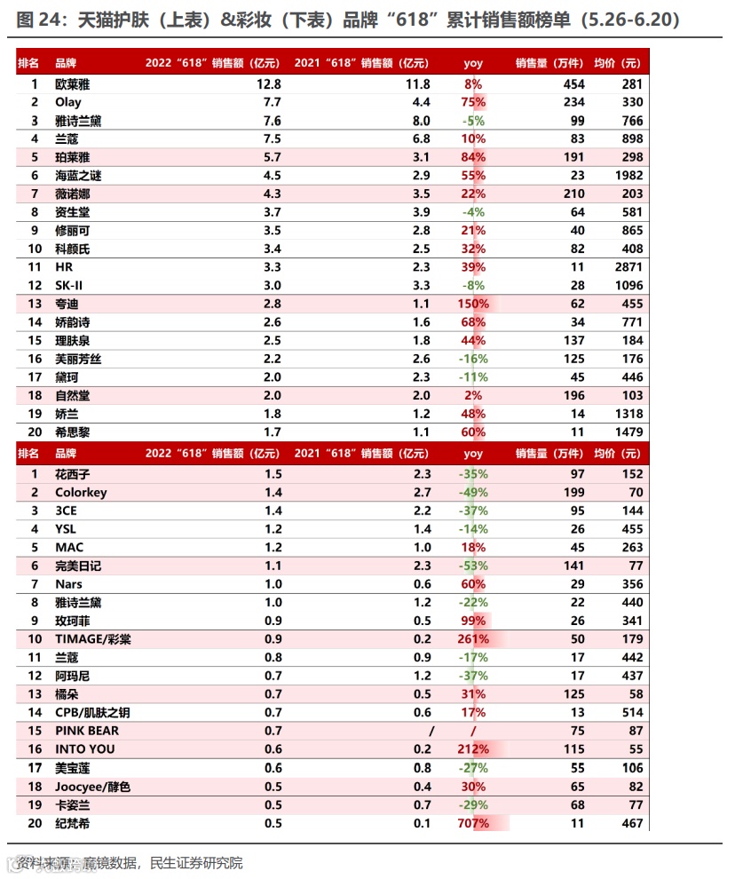 天猫美妆分品牌看:5月26日-6月20日,有4个国货品牌进入“618”美容护肤销售额前20,分别为珀莱雅(5):实现销售额5.7亿元,同比+84%,均价298元;薇诺娜(7):实现销售额4.3亿元,同比+22%,均价203元;夸迪(13):实现销售额2.8亿元,同比+150%,均价455元;自然堂(18):实现销售额2.0亿元,同比+2%,均价103元。有9个国货品牌进入“618”彩妆销售额前20,其中3个为上市公司品牌,分别为完美日记(6):实现销售额1.1亿元,同比-53%,均价77元;彩棠(10):实现销售额0.9亿元,同比+261%,均价179元;PINK BEAR(15):实现销售额0.7亿元,均价87元。