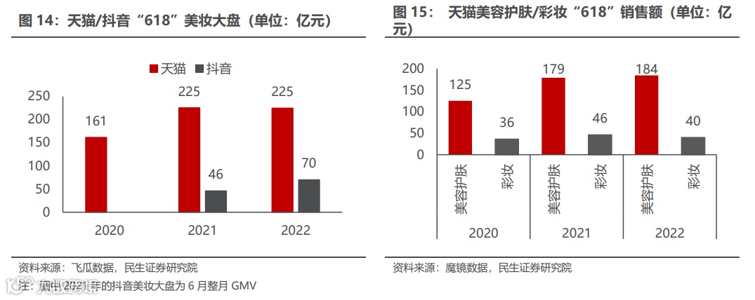 自2021年7月开始,化妆品零售总额单月同比增速开始回落,2022年3月以来,化妆品零售总额增速转负;从线上渠道的销售额来看,天猫美妆大盘自2021年7月开始转负,仅在“双11”期间受到大促催化实现了较高的增长;而抖音、快手等直播电商平台则处于快速增长阶段,抖音美妆单月GMV同比增速均超过100%。