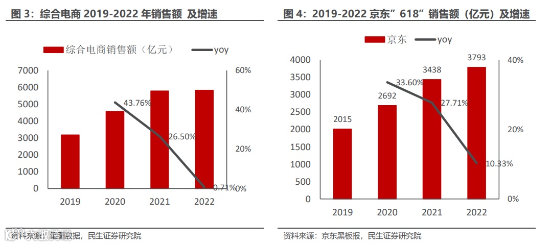 京东:从“618”数据披露上来看,京东依靠稳固的供应链以及3C品类厂商的大力促销表现亮眼,2022年“618”实现销售额3793亿元,高基数下同比增10.33%,远高于综合平台整体增速,与此同时今年天猫、拼多多均未披露销售额。