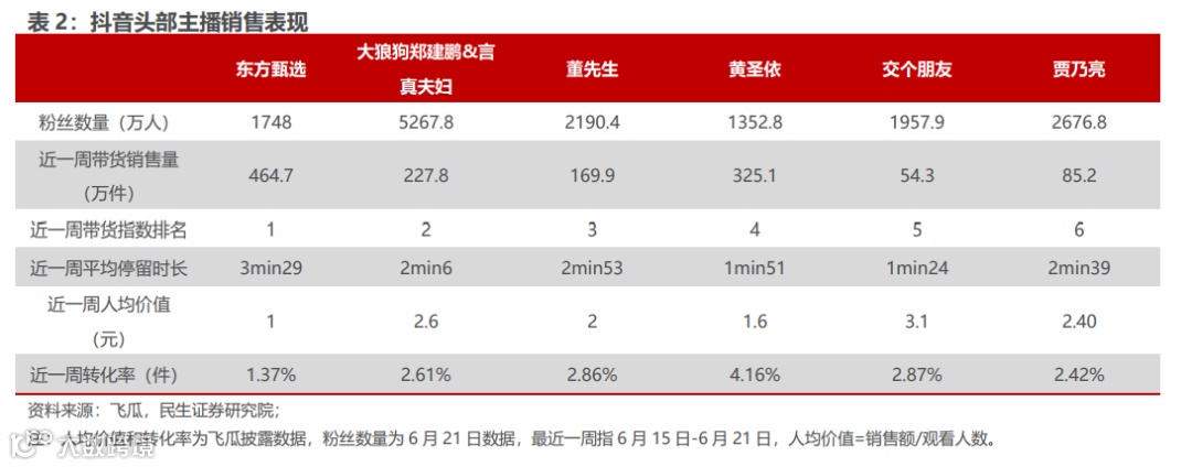 新东方直播带货账号“东方甄选“演绎现象级破圈,人均价值和转化率仍有较大上升空间。1)内外因共振助力东方甄选破圈:抖音流量扶持+头部主播停播下,东方甄选获得流量优势,公司通过多次尝试探索出”教师团队+直播运营+供应链“合理模式,以“双语带货”等知识输出为吸引点,辅以娓娓道来的风格吸引了一大批教育标签的粉丝。2)定位农产品,GMV和粉丝数量节节攀升。据飞瓜数据,6月1日至6月20日,东方甄选直播间预估销售额达4.2亿元,粉丝数量达1700万人,近半月涨粉1646万人。3)整体呈现“高用户停留时长+低人均价值、低转化率“一高两低特征,对标头部主播,人均价值和低转化率有2-3倍提升空间。