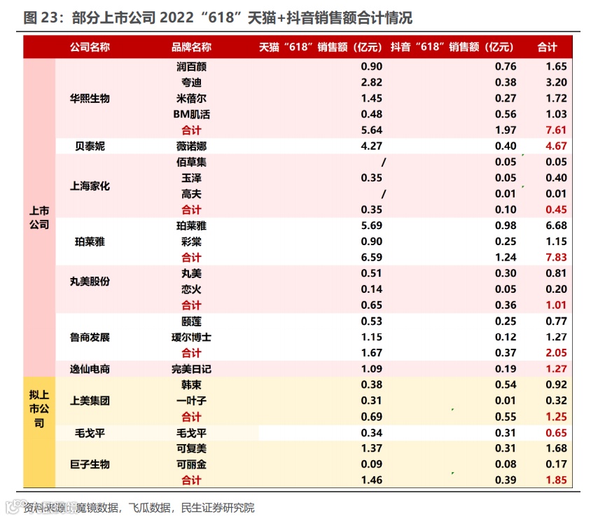 ①华熙生物:根据官方“618战报”:润百颜全渠道实现GMV 3.56亿元,其中天猫旗舰店1.14亿元,国货排名第8,抖音1.1亿元,yoy+1000%,快手5218万元,京东旗舰店1700万元,抖音快手的明星/达人直播达成销售额1.3亿元;BM肌活全渠道实现1.2亿元/yoy+187%,抖音自播GMV同比+1649.4%;夸迪全渠道实现3.63亿元/yoy+156%,国货美妆排名第3,抖音品牌主理人枝樊樊直播总GMV破亿;米蓓尔全渠道实现1.55亿元/yoy+199%,天猫旗舰店1亿元/yoy+200%,抖音3500万元/yoy+640%。