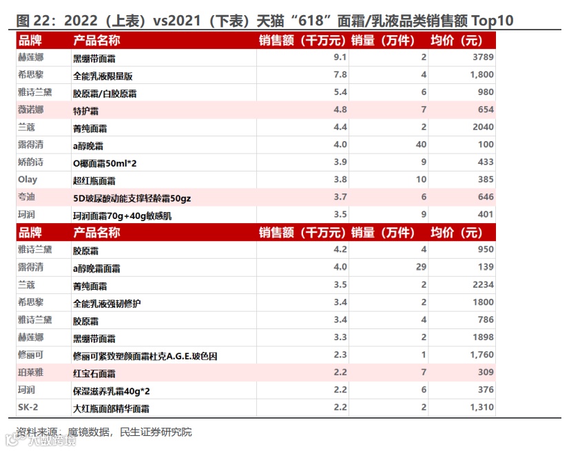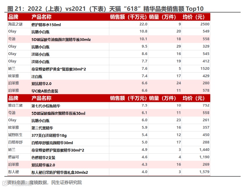 从销售额前10的单品来看:2021年唯一Top10的国货产品为玉泽的积雪草面膜,2022年国货品牌的高端产品(夸迪焕颜次抛)也进入榜单,我们认为这得益于国货的产品力正在不断提升。国货大单品从低产品生命周期的面膜品类拓展至精华品类,均价也随之上升。