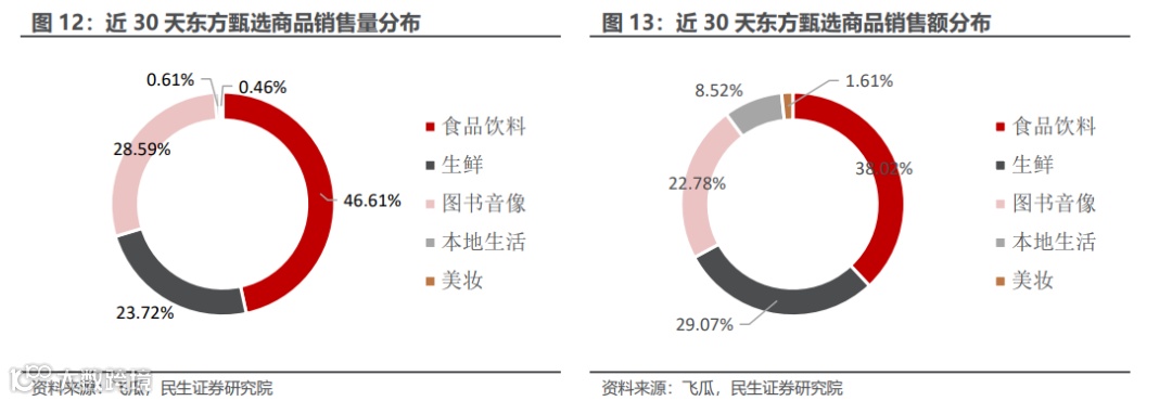 东方甄选定位农产品带货,从近30天销售量分布来看,公司带货主要集中在食品饮料、图书音像以及生鲜三大品类,各占比46.61%/28.59%/23.72%。从近30天销售额分布来看,食品饮料/生鲜/图书音像各占比38.02%/29.07%/22.78%。