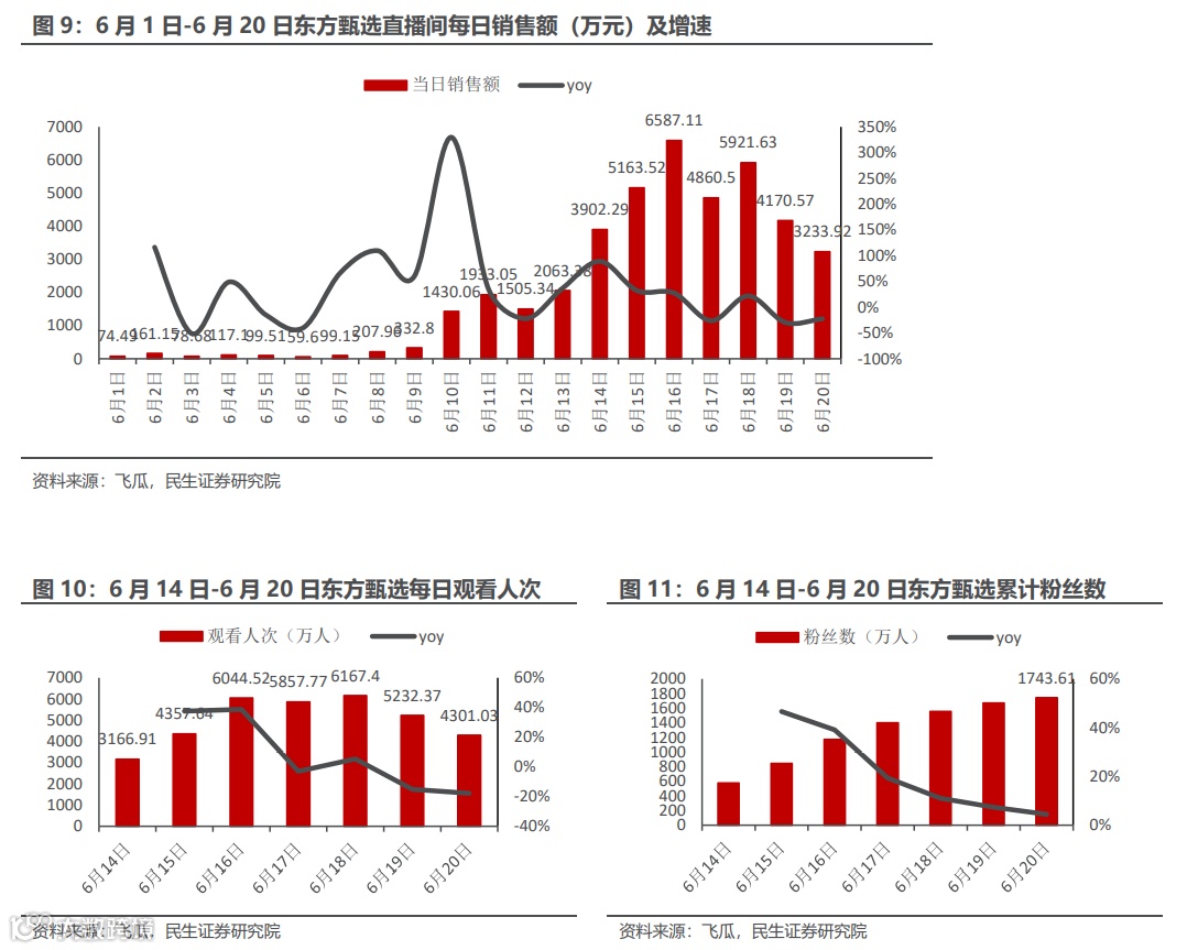 我们认为东方甄选在数据上的优异表现是内外因素共振的结构:1)外因:①头部主播缺位带来的流量外溢扩散到各个平台;②出于东方甄选正能量的带货风格以及抖音推动企业直播间的趋势下,抖音平台对东方甄选进行流量扶持助力其破圈效应。2)内因:公司通过持续的调整,在教师主播团队和直播运营模式上寻求到了较为合适的风格,不同于普通直播间平铺直叙的带货模式,东方甄选以“双语带货”、“英语知识点讲解”等文化内容为吸引点,以娓娓道来的风格吸引了一大批教育标签的粉丝。