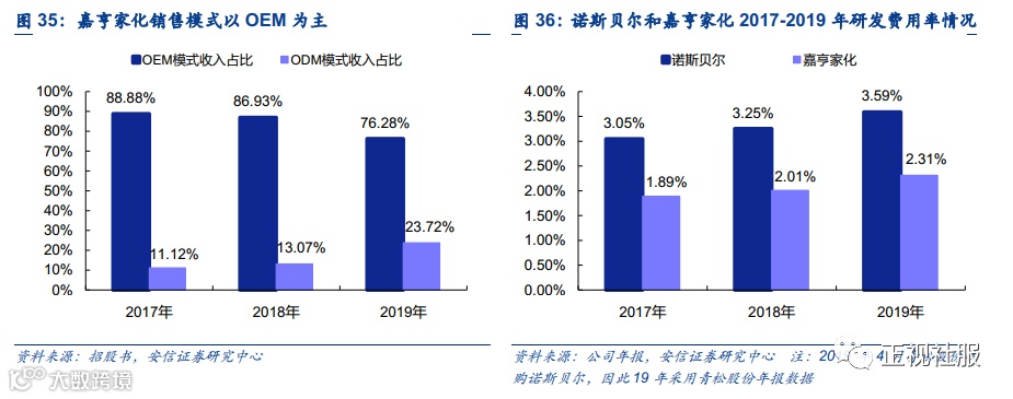 国内未来不断加码研发,有助于提高代工渗透率。近年来国内化妆品OEM/ODM企业持续加强研发力度,提供高质量的产品和服务,以提升品牌认知度,使得化妆品行业代工渗透率不断增强。中国本土化妆品ODM排名第一的企业诺斯贝尔不断提高研发费用率,2017-2019年研发费用率分别为3.05%,3.25%,3.59%,高于同行业水平。嘉亨家化同样重点加强ODM服务能力建设,累计投资3,341万元用于技术研发中心升级建设项目,通过购置先进的研发、检测设备,为公司扩大ODM业务规模提供技术保障。2017-2019年,嘉亨家化ODM模式下化妆品分别实现收入1658.28万元,3293.15万元,7375.48万元,占化妆品收入比例分别为17.45%,20.38%,32.19%,ODM占比逐年提升。