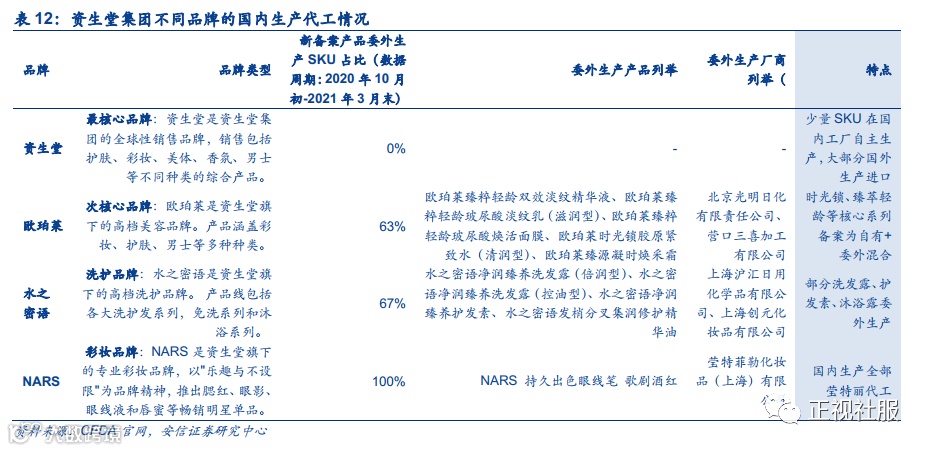 资生堂:在中国有上海和北京两个工厂,上海为资生堂中信化妆品有限公司,北京为资生堂丽源化妆品有限公司。资生堂品牌下,国产化妆品备案平台上有3个备案,均为自主生产;进口备案中均为日本或美国自有工厂生产。但资生堂旗下其他品牌如水之密语、欧珀莱等部分产品由国内代工厂生产;彩妆品牌NARS国内生产产品均为莹特菲勒化妆品(上海)有限公司代工生产。