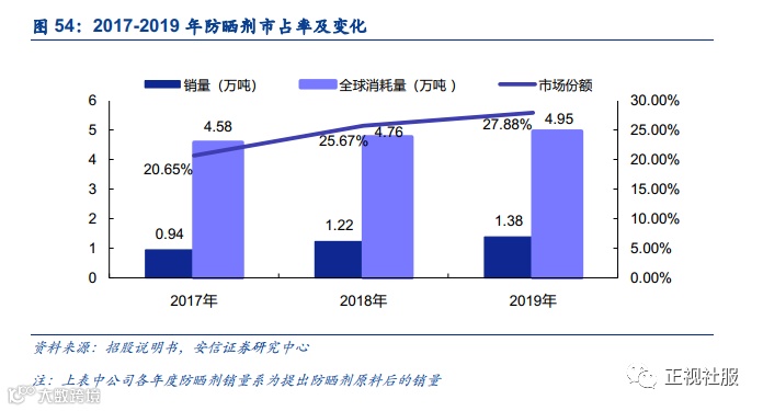 公司是全球最主要的化学防晒剂制造商之一,市占率逐年上升。公司主要从事日用化学品原料的研发、生产和销售,产品包括防晒剂等化妆品活性成分、合成香料等。公司是国内少数通过美国FDA审核和欧盟化妆品原料规范(EFfCI)认证的日用化学品原料制造商,在化妆品活性成分行业中的防晒剂领域拥有相当的竞争力,市场占有率和行业地位较高。全球防晒剂主要生产商在国际上以巴斯夫、德之馨等大型跨国公司为主,其在规模、技术、市场等方面均具有传统优势。国内以公司为代表的少数优势企业经过长期研发积累和市场培育,已经占有了可观的市场份额并持续扩大。根据Euromonitor预计,2016年至2021年,全球防晒剂消耗量将由约4.4万吨增长至约5.2万吨,年均复合增长率约4%,按照该假设,则公司最近三年防晒剂产品市场份额分别为20.65%、25.67%、27.88%,市占率逐年上升。