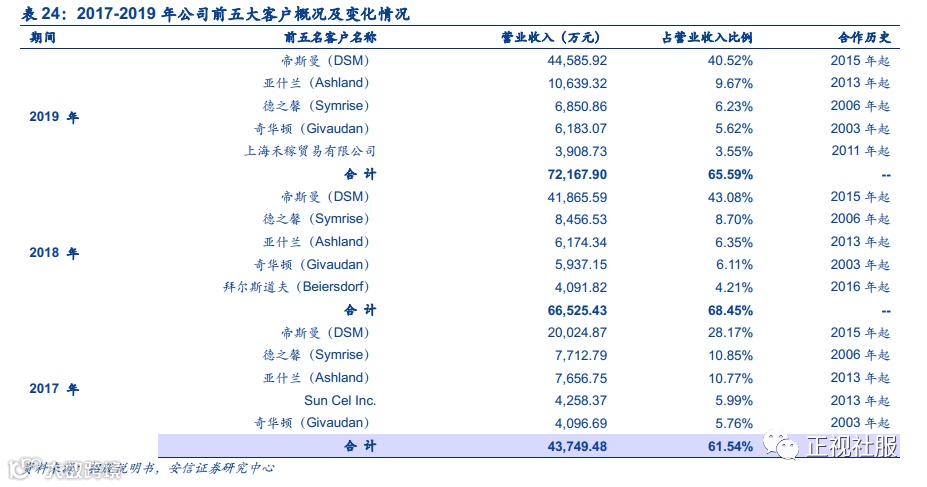 公司前五大客户营收占比较高。2017-2019年,公司向前五大客户(合并口径)合计销售额占当年公司营业收入的比例分别为61.54%、68.45%和65.59%,其中2019年公司向帝斯曼销售额占营业收入的比例为40.52%。公司的客户集中度较高是下游化妆品行业集中度高、公司重点开发大型跨国企业的市场策略以及与客户签订的长期销合同,这几方面原因形成的。