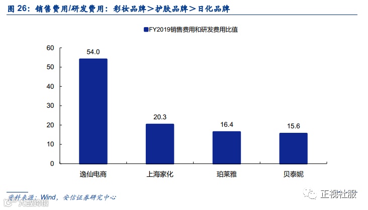 品牌商的销售费用率在30%-60%,以雅诗兰黛、贝泰妮、上海家化、珀莱雅的销售费用率为例。销售费用还包括品牌宣传费和促销费,以渠道商的毛利来看,渠道商包括代运营、线上平台以及经销商和线下终端的抽成,代运营的毛利率在30%-60%,线上平台的收费包括平台服务费、技术服务费、广告费等,其毛利率在25%-45%,经销商的毛利率在30%左右,线下终端的毛利率在40%左右。