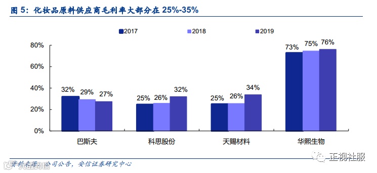 内容物原料供应商的毛利率大部分在25%-35%,以国际知名原料供应商巴斯夫和国内科思股份、天赐材料和及华熙生物为例,其化妆品活性成分业务毛利率大致处于25%-35%区间,华熙生物作为玻尿酸原料的龙头企业,在成本上具有一定优势,因此毛利率大幅高于其他原料商。