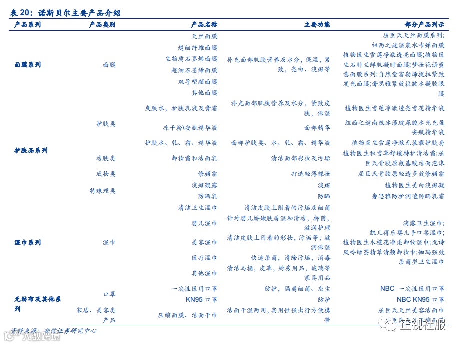 子公司诺斯贝尔是国内最大的面膜生产企业,拥有超过十年信誉的知名化妆品ODM研发生产企业之一。青松股份主要从事松节油深加工系列产品的研发、生产与销售。在现有业务的产业链上,公司于2019年完成对诺斯贝尔90%股份的并购,增加面膜、护肤品、湿巾等化妆品的设计、研发与制造业务,2020年全资子公司广东领博完成对诺斯贝尔剩余10%股份的收购,公司及子公司合计持有诺斯贝尔100%股份,2020年度诺斯贝尔营收为26.7亿元,为母公司贡献了超过50%的营业收入。诺斯贝尔积极发展ODM业务,注重产品开发以及配方研发,每年有超过150+新品发布,目前为止已拥有专利50项,其中发明专利22项,实用新型专利26项,外观设计专利2项。在国际品牌本土化趋势加快的环境下,其良好的适合中国人的配方让代工更具性价比优势。面膜是诺斯贝尔的强项,2020年面膜营收占比37.1%。