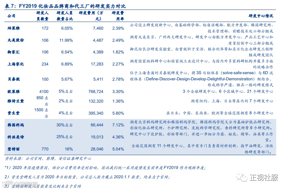 在研发投入比重上,ODM企业对研发投入更为聚焦,其研发人员占总员工人数的比重,以及研发费用率普遍比化妆品品牌商更高。FY2019,国外ODM巨头韩国科玛、莹特丽和科丝美诗的研发费用率在5%-8%区间,研发人员占比高达15%-30%,而国内外头部化妆品品牌商研发费用率多数在1%-4%,研发人员占比基本在10%以下。