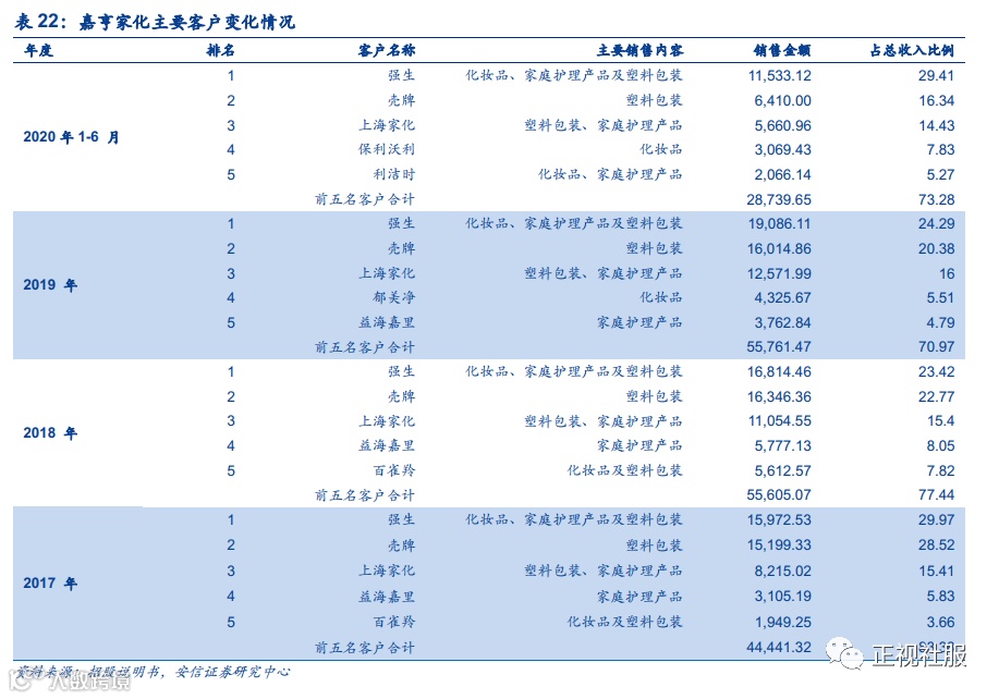 覆盖化妆品产业链制造端,国内领先的具有家化产品及塑料包装容器的设计、生产、销售的一体化服务的创新型企业。公司的主要产品包括护肤类、洗护类、香水等化妆品,香皂、消毒液、洗手液、洗洁精等家庭护理产品,以及配套的塑料包装容器。截止目前,公司有170余项专利,其中发明专利32项,是国家高新技术企业,通过工信部信息化和工业化融合的管理体系认证,通过福建省知识产权优势企业认证、福建省科技型企业认证、福建省科技小巨人企业认证。主要服务的品牌有包括强生、大宝、气味图书馆、六神、利洁时、郁美净、壳牌、多特瑞、百雀羚、薇诺娜、联合利华、维多利亚的秘密、宝洁等。被多次认定为零缺陷项目合作伙伴,为大宝SOD蜜新装上市做出杰出功效,系郁美净最佳战略合作伙伴、上海家化优秀供应商、百雀羚最佳合作伙伴、壳牌最佳供应商。公司目前客户集中度相对较高,与公司所处的发展阶段有关,公司在发展初期,为了更好地控制经营风险,尽可能降低客户开发成本和应收账款回款风险。