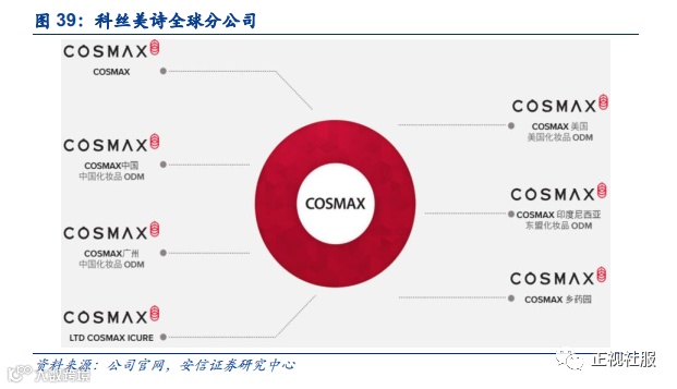 三位一体优势:研发能力,化妆制造技术以及客户服务。为了保证产品的科技优势,科丝美诗每年会将营收的5%或以上投入到化妆品研发当中,科丝美诗还拥有强大的科研团队,在韩国研发人员有162名,中国研发人员有60名。科丝美诗有优异化妆制造技术以及严格的品质管理系统,其已经获得ISO22716(国际化妆品标准),OHSAS18001(安全及健康管理),以及ECOCERT(自然和有机标准化妆品)等众多国际认证,可以为国际化企业提供优良供应环境。科丝美诗具有极高反应客户需求的对应能力,竞争对手开发新品需要6~7个月,科丝美诗只需3个月就可以供应,这也是科丝美诗与其他公司差异化的竞争力,同时其为客户提供持续的新产品提案和适量,按时供应等ODM企业本应有的服务以外开发最新电子系统,把客户的问题提前解决,或者按照客户的要求补充提高系统等。