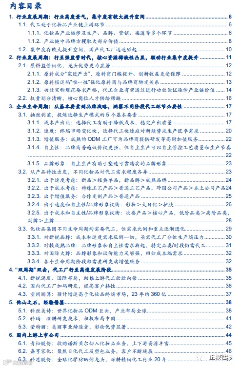 ■行业发展周期:行业高度景气,行至强监管时代驱动代工环节集中度提升。我国化妆品行业高度景气,根据欧睿数据,过去5年化妆品行业增速10%左右领跑全球,且涌现出精华、彩妆等高速增长的细分市场。化妆品代工处于行业中上游,该环节价值占化妆品终端价格10%左右,且市场集中度存较大提升空间。行至强监管时代,核心资源稀缺性凸显,驱动行业集中度提升。①原料成分“宽进严出”,原料商门槛提升、创新收益更受保障;②每原料商每原料的原料报送码具“唯一性”,原料报送码进入化妆品产品备案文件,将强化原料商与品牌商绑定关系;③功效宣称规范要求严格,考虑到功效宣称评价体系需要较大固定资产投入及团队建设成本,代工环节更具规模效应、有望通过进行功效论证延伸产业链价值。④化妆品注册人、备案人、质量安全负责人、境内责任人的资质及责任要求清晰;化妆品注册人、备案人、受托生产企业应当设置质量安全负责人,未依照规定设置,将面临罚款、停产停业、吊销许可证,甚至5年内禁止从事化妆品行业的处罚,使得 “质量安全负责人”缺口扩大;根据猎聘及BOSS直聘,可以看到已经有大量的化妆品质量安全负责人招聘需求,其薪水普遍高于行业其他岗位。