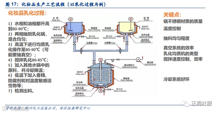 化妆品生产涉及到多个环节,操作的各个环节都可能造成最终产品的差异。以化妆品乳化过程为例,在生产乳膏霜的过程中,需要先将水相和油相升高到80-90℃,然后经历高温下的均质和搅拌乳化、冷却降温、检测出料等过程,在这个过程中,设备层面(乳化均质机的类型、锅不锈钢材质的质量、真空&冷却系统的好坏、温度控制等)和人工层面(针对不同配方选择哪种工艺,乳化过程中搅拌多少次、原料投放时间等)都会直接影响成品的效果。以搅拌为例,对于不同大小的锅和不同的料体搅拌的工艺参数都需要精心调节,搅拌桨速度过快会对某些料体产生破坏性影响,而速度过慢会造成搅拌不均匀,可能会导致护肤品“颗粒”、“搓泥”等问题。