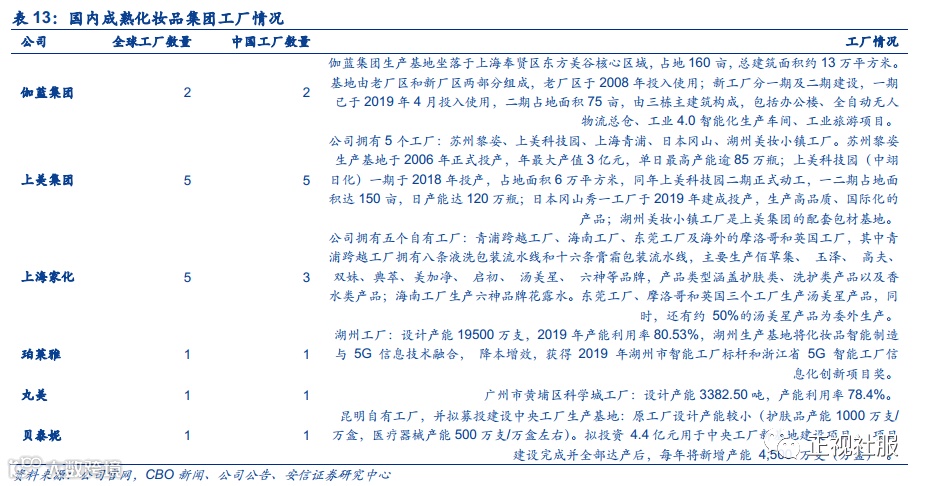 成熟化妆品品牌对形象和自主性需求渐起,布局上游自建工厂。随着品牌逐渐成熟,对消费者覆盖渐广,提高品牌粘性、增加复购、稳固品牌形象的需求逐渐提升,上游生产端与研发密切相关,因此催生布局产业链上游的需求,以便更好自主把控生产环节的节奏和质量,并塑造深耕生产研发、踏实打磨产品的品牌形象。伽蓝集团生产基地坐落于上海奉贤区东方美谷核心区域,占地160亩,总建筑面积约13万平方米,老厂区于2008年投入使用;新工厂一期建设投资2.1亿元,建筑面积4万平方米,核心功能为护肤工厂和质检中心,于2019年投入使用;上美集团拥有国内上美科技园生产基地(中翊日化为第一期项目,工厂按照GMPC标准建造,预计产能将达120万瓶/天),一二期全面积达17万平方米;根据新浪新闻和公司官网,上美集团拥有上美科技园、苏州黎姿工厂、上海青浦工厂、湖州美妆小镇工厂、日本冈山生产基地5个工厂;上海家化拥有青浦跨越工厂、海南工厂、东莞工厂及海外的摩洛哥和英国工厂5个生产基地。珀莱雅和丸美分别拥有湖州工厂和广州工厂。