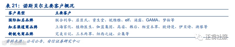 诺斯贝尔对前五大客户占营收比例逐年下降,多元化客户结构有利于可持续稳定的发展。2016-2018 年诺斯贝尔前五大客户营收占比分别为 61.05%、57.29%、43.29%,对大客户的依赖性逐渐降低,从而销售风险降低,多元化的客户类型有利于诺斯贝尔长期、可持续稳定的发展。诺斯贝尔的客户遍布国际知名品牌、知名渠道商品牌、社交电商品牌、新锐电商品牌、微商品牌,知名品牌对供应商筛选非常严格,并对优质供应商存在持续依赖,因而能够为诺斯贝尔持续增长的订单提供良好保证。诺斯贝尔多次获得主要客户的认可和奖项,例如联合利华公司颁发的“2019年度创新驱动奖”、伽蓝集团颁发的“2019年罗文奖”、高姿集团颁发的“精诚协作奖”等。