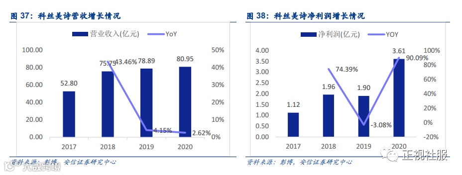 科丝美诗营收基本稳定,净利润实现快速增长。2017年到2020年科丝美诗的营业业收入分别为52.80、75.75、78.89、80.95亿元,其中2018年增速达到了43.46%,在2019年和2020年增速放缓。2017年到2020年科丝美诗的净利润分别为1.12、1.96、1.90、3.61亿元,净利润基本在逐年以较高水平增长,仅在2019年出现负增长情况,在2020年增长率达到了90.09%。