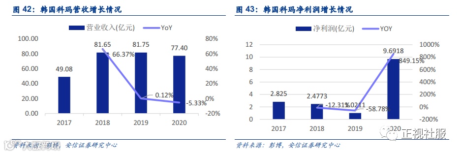 韩国科玛营业收入基本保持稳定,净利润有所波动。韩国科玛2017年到2020年营业收入分别为4908.03、8165.26%、8175.10和7739.57百万元,18年增长幅度达66.37%,在19年增速放缓,20年出现负增长。其利润2017年到2020年利润分别为,282.5、247.73、102.11和969.18百万元,20年利润出现剧增,利润率在2018年以及2019年连续出现负增长,19年达到-58.78%,20年利润达率849.15%。