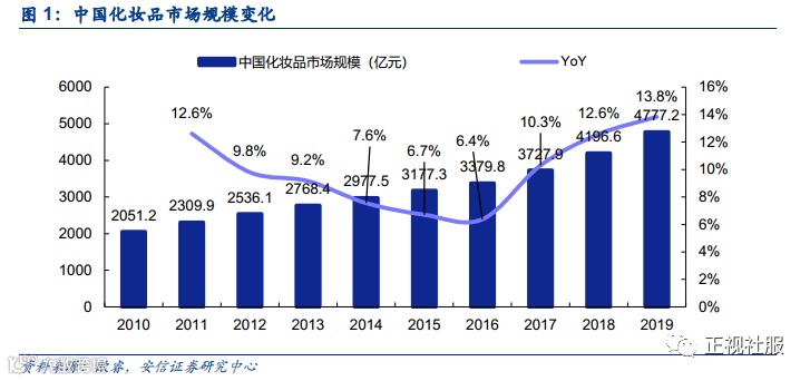 根据欧睿数据,根据Euromonitor数据,2019年我国化妆品市场规模达4777.2亿元,2014-2019年复合增速达9.9%,领跑全球,且涌现出精华、彩妆等高速增长的细分市场,行业高度景气。