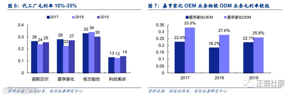 成熟的代工厂生产产品品质稳定,生产规模大摊低成本。成熟的代工厂对化妆品生产和报备流程都比较熟悉,并在长期实践中形成较为成熟的管理体系和流程,产品品质稳定,同时代工厂生产多个客户产品,生产规模大,工艺成熟,比品牌自己小批量生产成本更低。国内知名代工厂商嘉亨家化在长期的日化产品生产过程中,基于日化产品制备原理、工艺优化、安全有效性研究、稳定性控制等多个方面构建了较为完备的技术体系。产品批量生产前,需经过 2-3个月的实验室及小批量试验,对配方工艺参数进行论证;在生产过程中及成品交付客户前,公司进行严格的微生物检测、理化检测,确保量产产品质量长期稳定,能够通过客户3-6个月的现场验厂等一系列审核程序,成功融入国内外知名日化品牌商供应链。