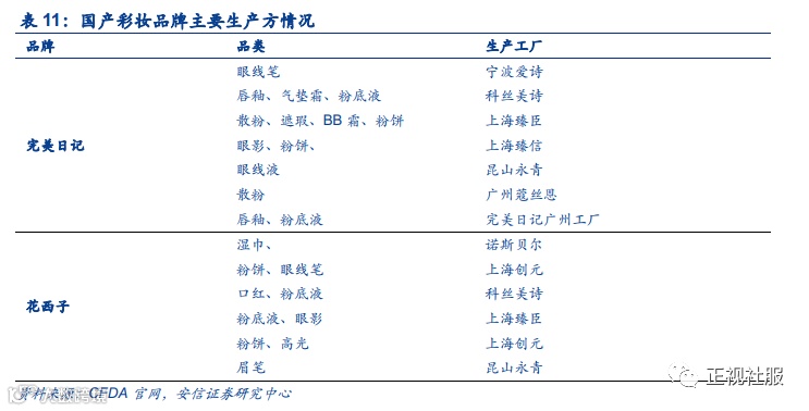 完美日记:旗下产品绝大多数由代工厂生产,自有广州从化工厂,合作科丝美诗、广州蔻丝恩、上海臻信、上海臻臣等。