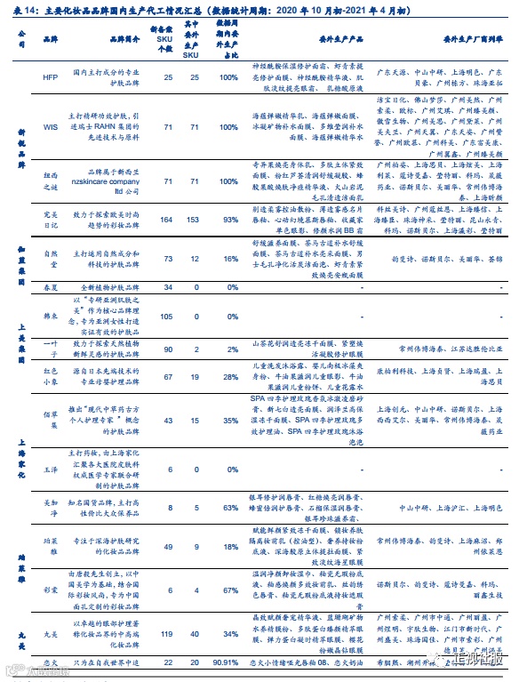 珀莱雅:旗下品牌珀莱雅大多数产品自主生产,少数彩妆类、面膜类产品由代工厂生产;旗下彩妆品牌彩棠多由代工厂生产。