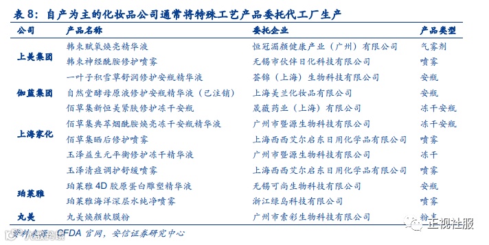 喷雾、安瓶等包含特殊工艺产品生产需要单独开辟产品线,或者需要新的技术,自建生产线成本较高,因此选择代工厂生产。从目前自主生产为主的化妆品集团看,喷雾、安瓶、粉末等特殊工艺化妆品为其为数不多的委托代工厂生产的产品类型之一。上美集团旗下的韩束赋氧焕亮精华液(气雾剂包装)、一叶子积雪草舒润修护安瓶精华液(安瓶包装)、伽蓝集团旗下的自然堂酵母原液修护安瓶精华液、以及上海家化旗下的佰草集新恒美紧肤修护冻干安瓶等特殊包装/特殊工艺产品,均委托代工厂进行生产。