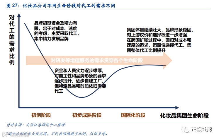 在化妆品集团发展的各个生命周期中均需要代工厂的参与,但需求的比例和重点不断进化。在品牌初创阶段,公司资金和精力都很有限,出于对成本、速度的考虑,主要采取代工,集中精力发展品牌;随着品牌逐渐成熟,资金和人员实力逐步雄厚,对自主性和品牌形象的要求逐步提升,开始自建工厂,降低代工比重,但特定品类和时段依旧需要代工;集团体量继续壮大,发展至跨国公司,品牌形象稳固,对上游议价和选择权进一步增强,在集团跨国扩张过程中,重新回归对成本和速度的追求,策略性选择代工,集团整体代工比例提升。各个阶段对代工厂的需求重点和比例不同,但是研发端的增值服务是各个生命阶段的品牌都需要的。