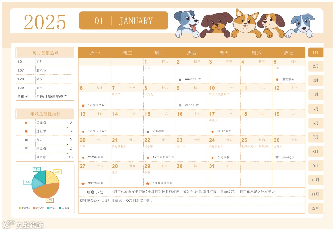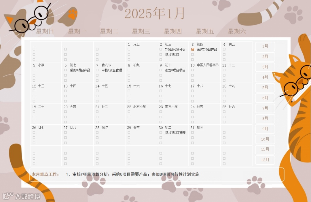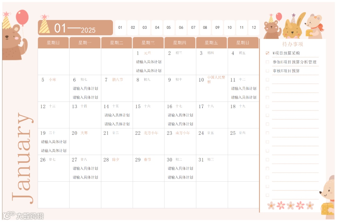 精选33款2025年日历表格模板,涵盖横版、竖版多种布局,部分模板集成农历显示与待办事项功能,适用于家庭张贴或办公使用。支持以周为单位的视图设计,每日时间分段清晰,便于详细日程规划。所有模板均采用Excel格式,可直接在电脑端查看与编辑,完成任务后一键划除,操作便捷。