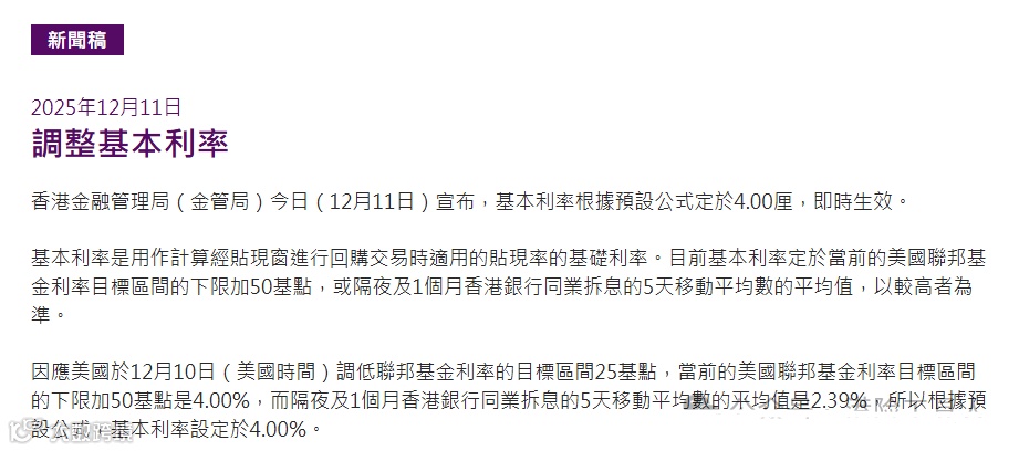 紧跟着,香港金管局立即将基准利率下调25个基点至4.0%,即时生效。