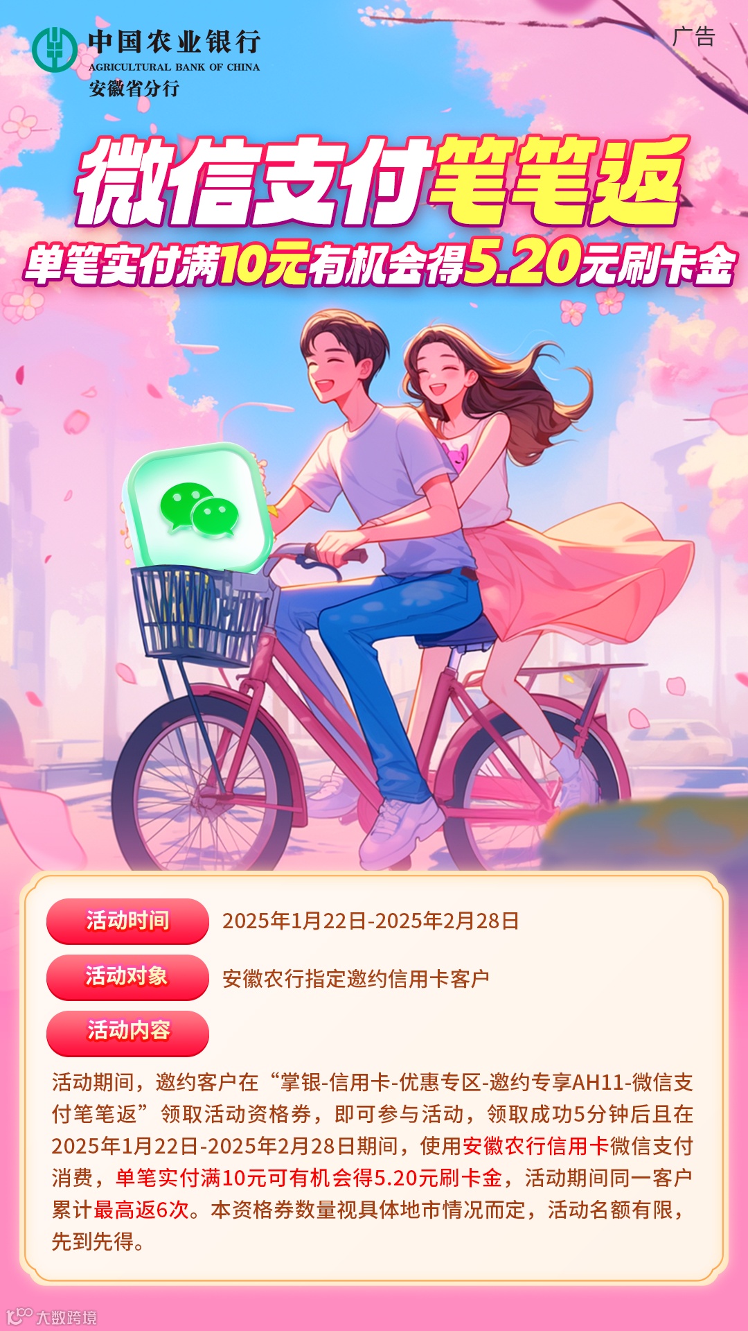 【消费返现】微信支付单笔满10元有机会得5.20元刷卡金