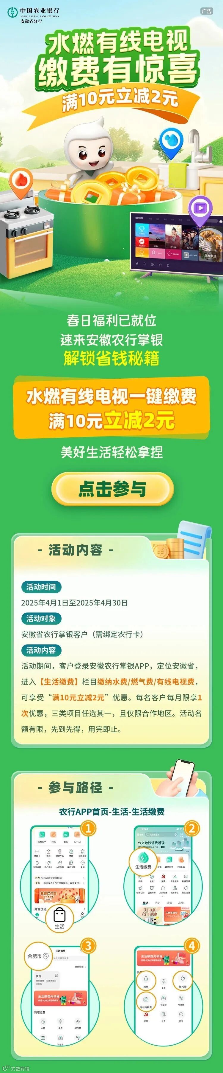 【生活缴费】水费/燃气费/有线电视费,满10元立减2元