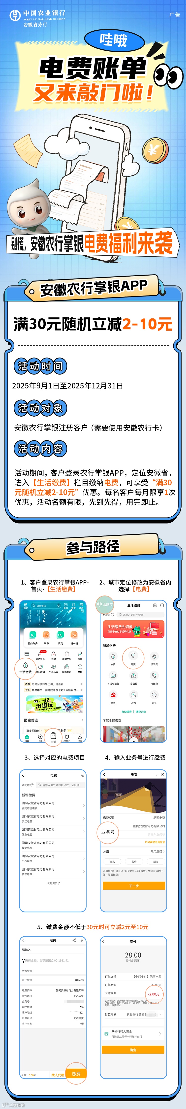 【掌银支付】电费缴纳,满30元随机立减2~10元