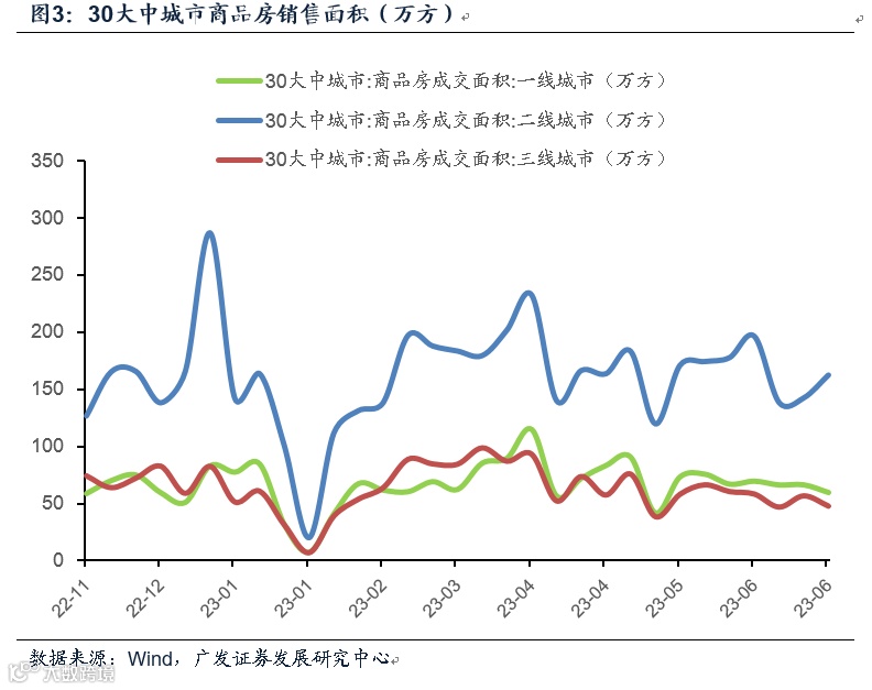 6月30城地产销售延续弱势,但并未单边下行。月度日均成交面积41.6万方,略低于4-5月日均成交的42.6、42.8万方。其中周度数据分别录得48、36、38、34、64万方,最后一周(6月25日-6月30日)回升明显。一、二、三线城市6月日均成交面积同比录得-18.5%、-40.0%、-24.6%。