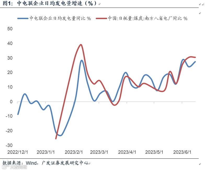 第一,低基数和高温天气推动发电数据同比走高,不过气温因素影响较大且很难进一步剥离。中电联统计6月2日-8日、6月9日-15日燃煤发电企业日均发电量同比增速24.1%、27.6%;去年6月3-9日、6月10-16日同比分别为-16.3%、-18.7%,粗略对应今年6月前两周两年复合增速为1.9%、1.9%,这一数字要高于5月。截至6月26日,6月南方八省电厂日均耗煤206.3万吨,环比5月增长16.4%,高于去年6月环比的12.7%。中电联表示“受气温升高、负荷增大影响,发电量环比大幅增长”。