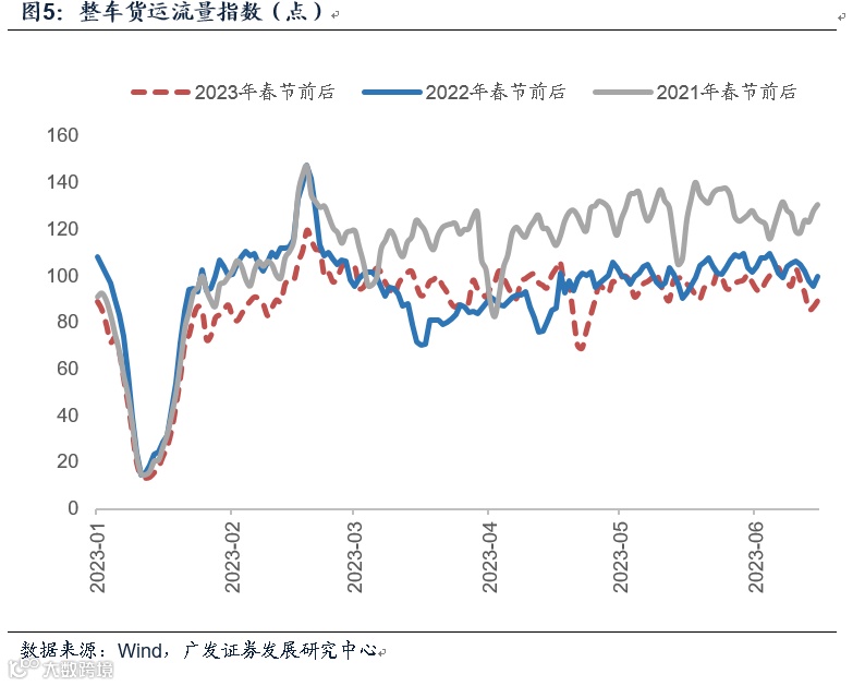 6月整车客运流量环比小幅上行,同比依然偏弱。1日-7日、8日-14日、15日-21日均值分别为97.0、97.0、100.2,端午期间(22日-26日)均值为90.5。前26日均值较5月全月均值92.5回升4.5%,相较去年同期(6月前26日)回落6.3%。整车货运量代表生产性服务业的情况,其背后广泛对接内需工业、建筑业、出口等终端需求。