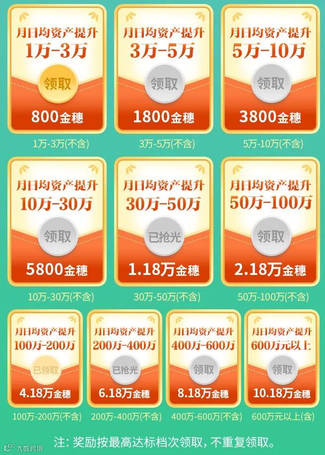 1、活动期间,持有安徽农行银行卡的掌银客户点击报名参加活动,9月月日均AUM较6月月日均AUM提升相应档次,10月15日上午9点整至10月31日24点可有机会领取1份对应达标档次金穗奖励,每月金穗数量有限,领完即止。
