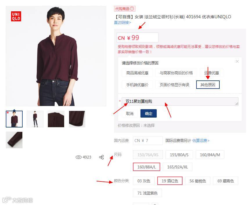 谨记:在修改价格原因处,选择【其他原因】,并且在备注栏填写具体原因:【双11抢购】提交订单后,Superbuy的贴心客服将根据你提交的订单详情,于11月11日帮你抢购该商品。