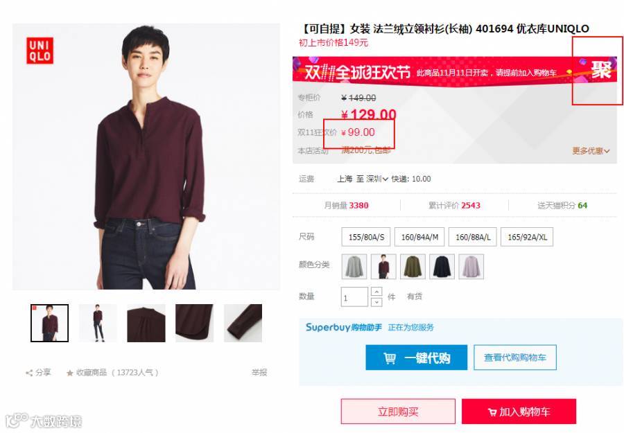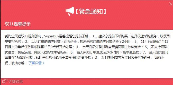 因为双十一期间,商家的库存量有限,并且促销商品常常是以限量进行销售的。并且由于活动打折力度大,用户量会进行暴增。但是Superbuy承诺会竭尽全力为你进行抢购。对于购买的不确定性我们感到非常抱歉。