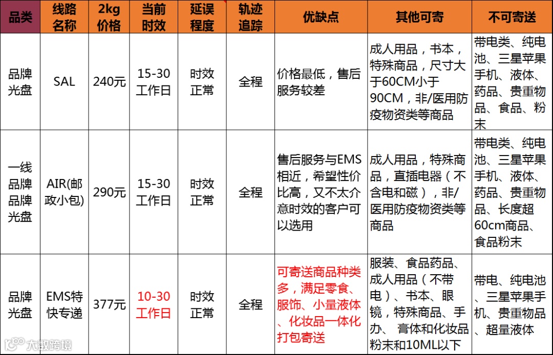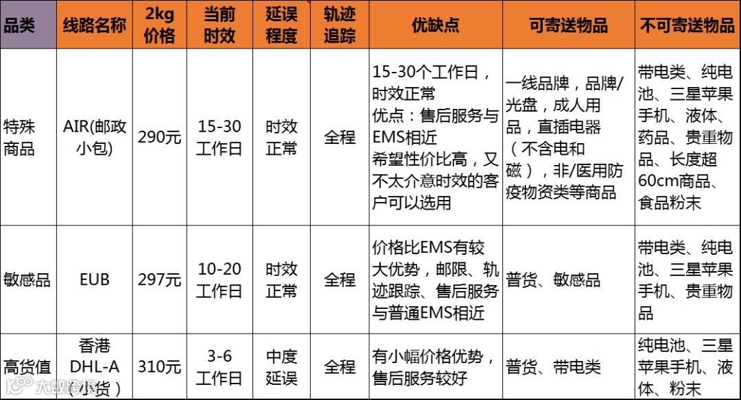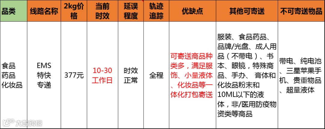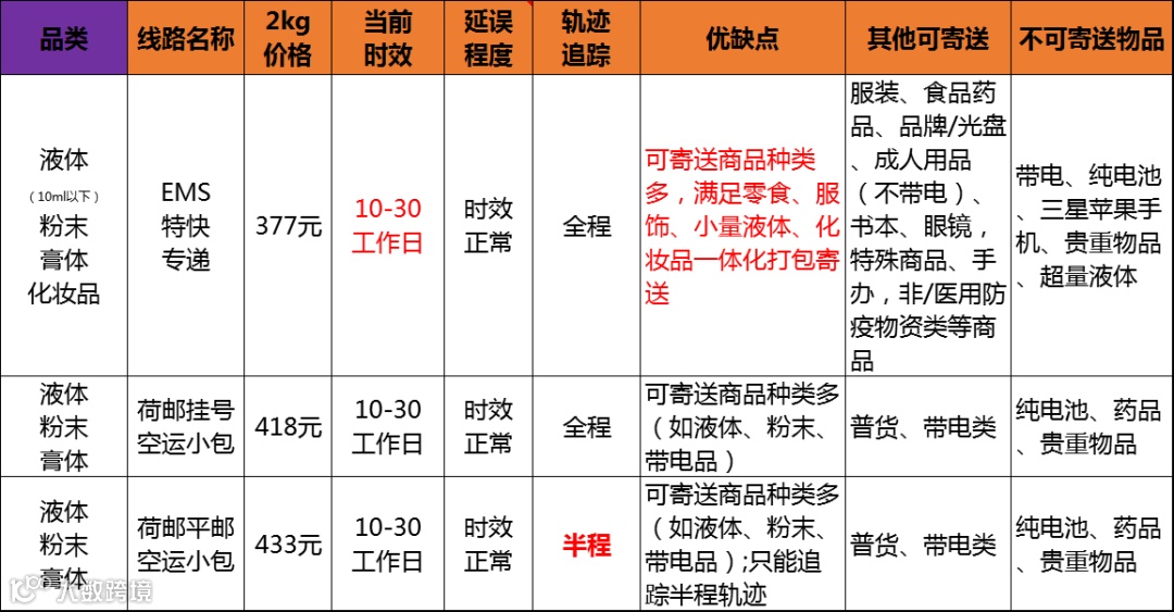 服务由中国邮政承寄,通达国家广,可寄送商品种类多,能邮寄服装、食品、药品、品牌/光盘、成人用品(不带电)、书本、眼镜,特殊商品、手办、 膏体和化妆品粉末和10ML以下的液体,还有口罩、茶叶等敏感货,物流商承诺时效在5-10个工作日,因为疫情原因当前时效在10-30个工作日。价格2KG预估总价377元,因为寄送范围广,以及价钱的合理性,被不少小伙伴们称为性价比之王。