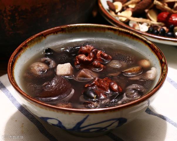 芡实,具有固肾,补脾止泄,利湿健中之功效。外加核桃和“补肾三宝”之一的黑豆,不仅可以补养肾气还可以抵抗寒冷,而且能够润肺生津,具有很好的保健功能。