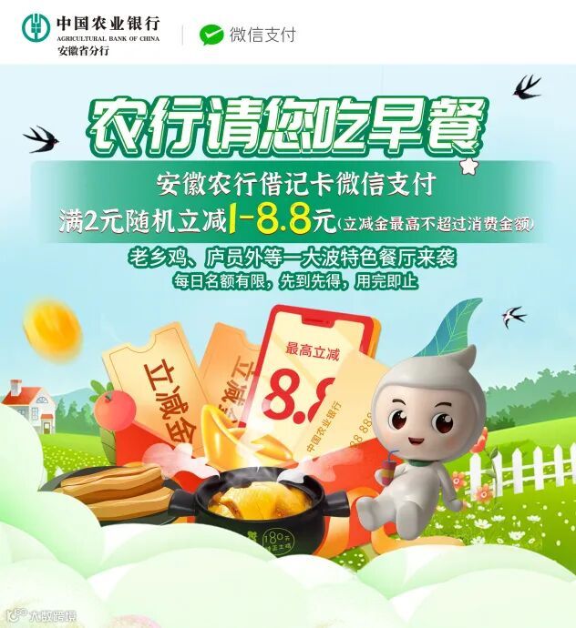 活动期间,客户在安徽省内指定餐饮商户消费时,选择安徽农行借记卡绑定微信支付即可享受满2元随机立减1-8.8元优惠(立减金最高不超过消费金额)。每日名额有限,先到先得,用完即止。