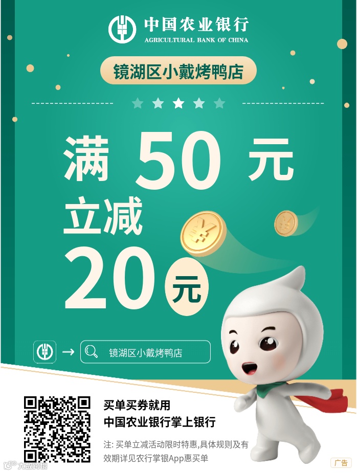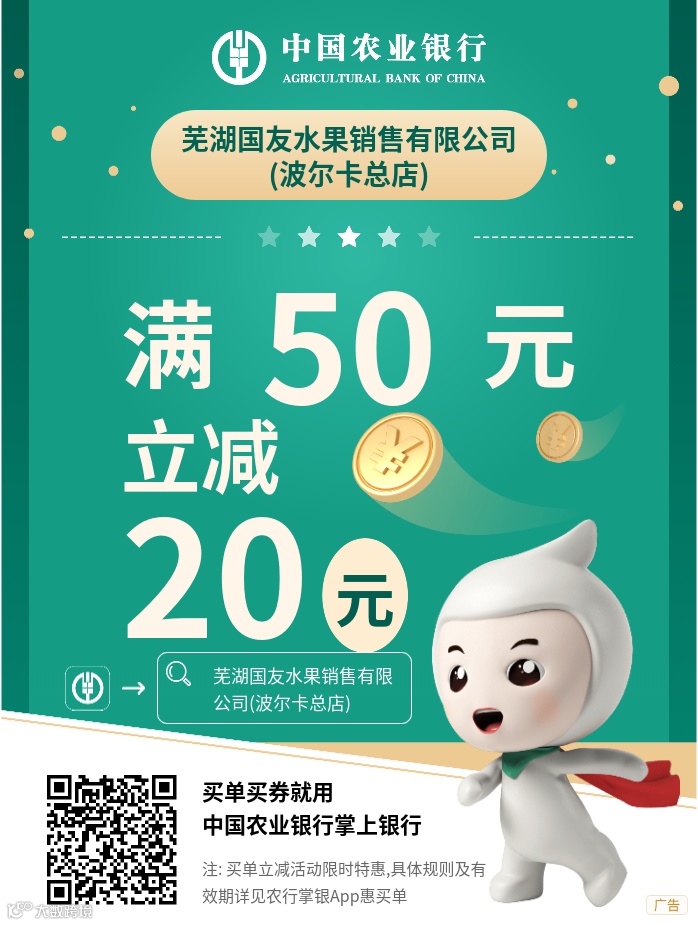 无为市程嫂食品、湾沚区六郎益然香木榨产业园、繁昌区春谷酒坊、繁昌区溪花小磨麻油、繁昌区老许香菜、繁昌区老许香菜直营店、南陵县蒲桥金梅饭店、镜湖区小戴烤鸭店、芜湖国友水果销售有限公司(波尔卡总店),每人每月登录农行掌银扫码支付即可享受二次。