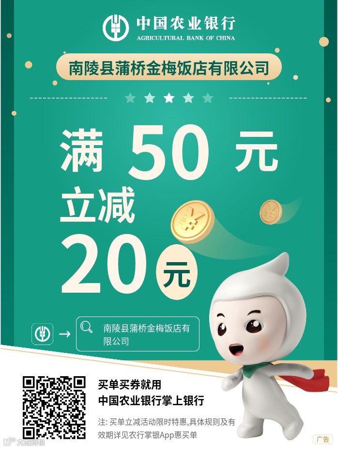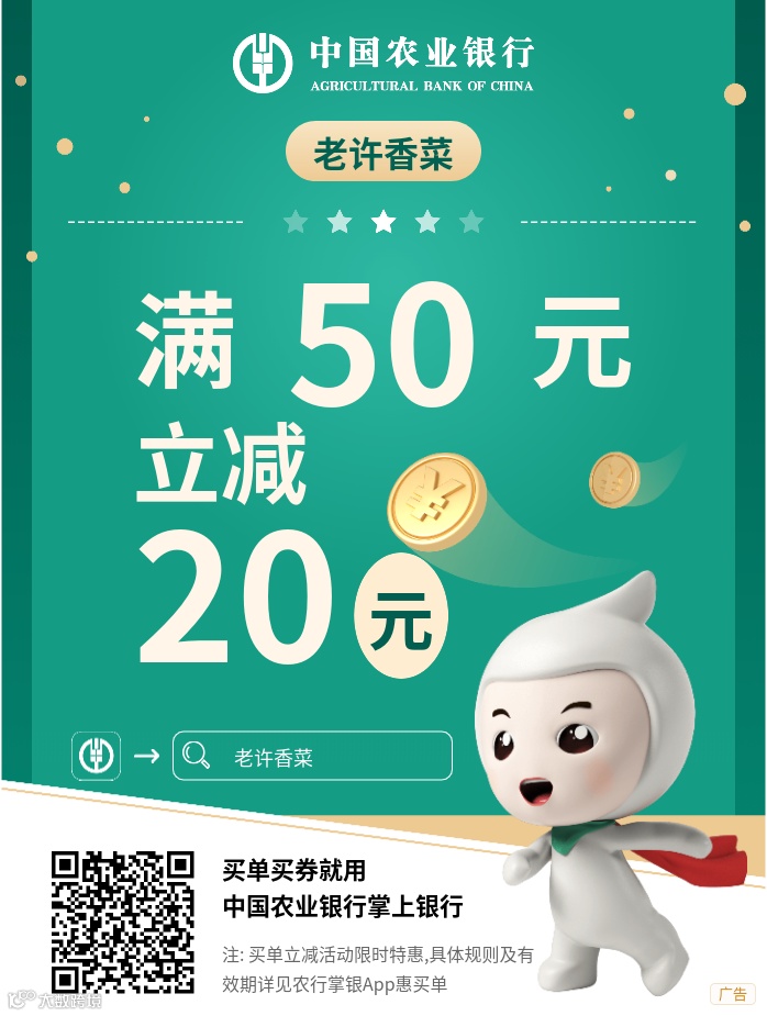 活动期间,客户登录农行掌银APP,城市定位芜湖,在“老字号”商圈使用农行掌银到店扫码支付,即可享受满50元减20元优惠。单用户每月限享2次优惠。