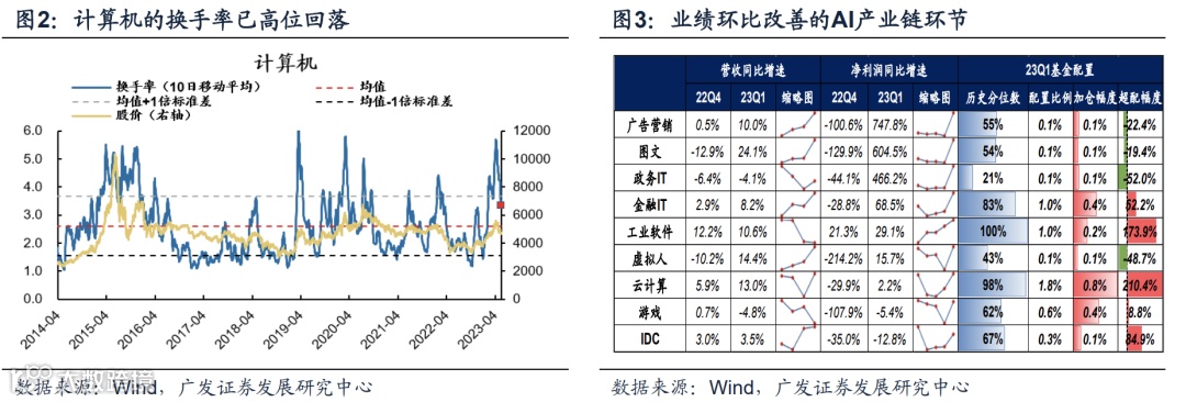 我们在4.16《四月决断期,思变三重奏有何变化》中对于AI+行情的节奏做出预判:13年“移动互联网+”行情第一波持续快速上涨时长为93天,代表指数涨幅67%,估值提升幅度72%;截止4月14日今年wind AIGC指数上涨60%,指数第一波的时间空间与13年移动互联网行情日渐接近或带来行情调整。13年移动互联网行情的三次调整时间在40日以内、指数调整幅度在15%以内,每次调整都提供布局良机;目前AI +已调整超过1个月、概念指数下跌11%-16%,调整时间空间与13年水位接近,由于产业创新滚滚向前,且除了传媒之外,计算机、电子、通信的换手率已有明显回落,此时不妨积极一些。