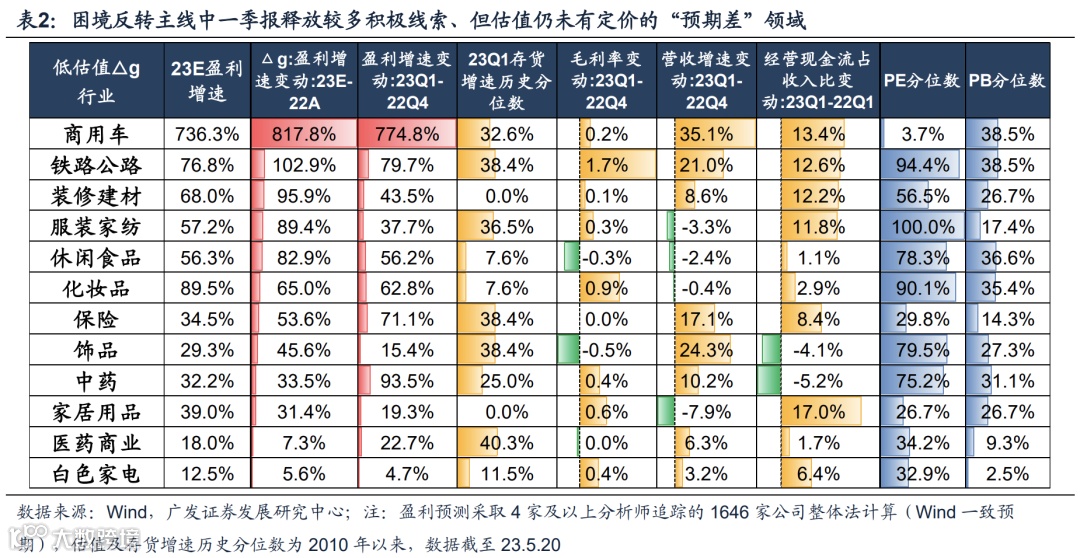 综合一季报业绩与当前估值隐含的较悲观预期,可以找寻存在“预期差”的占优行业:(1)23年预测△g、且一季报已率先实现盈利增速环比改善;(2)库存去化充分(库存增速分位数低于40%、多数低于30%);(3)收入/毛利/现金流出现积极变化(营收增速环比改善、毛利率环比改善、经营现金流占收入比较去年同期改善);(4)当前估值水位仍低(估值分位数低于40%、多数低于30%)。目前困境反转方向中占优行业集中在——投资链(商用车/铁路公路)、地产后周期(装修建材/白电/家具)、医药(中药/医药商业)、消费(服装/化妆品/饰品/休闲食品)、金融(保险)。