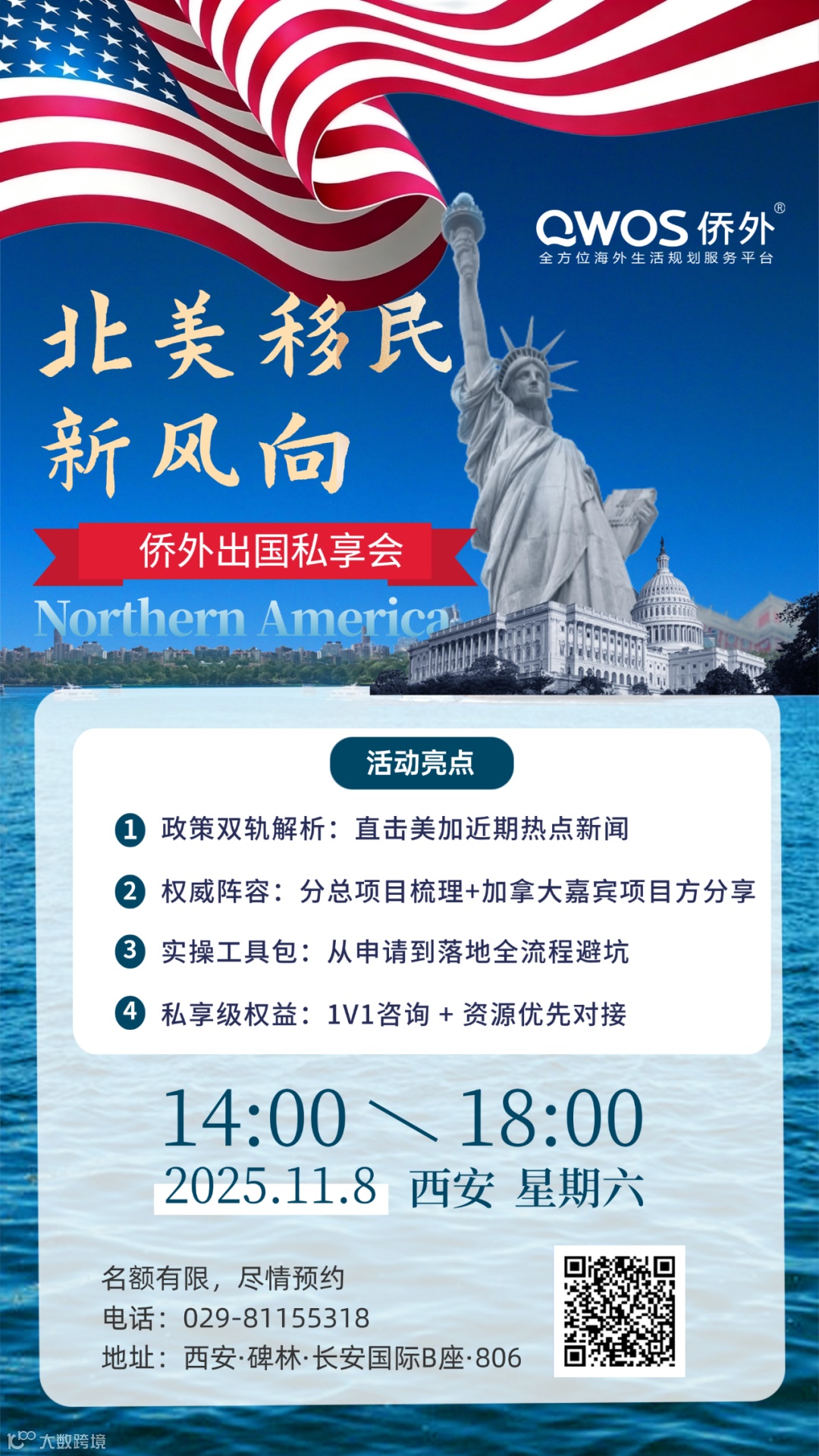作为 “全方位海外生活规划服务平台”,侨外始终以专业、贴心的服务为您的移民梦保驾护航。这场私享会,是您近距离了解北美移民新趋势、获取权威信息的机会,开启您的北美移民规划第一步!机遇不等人,快扫描下方二维码咨询侨外资深顾问吧↓