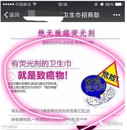 在淘宝一家台湾某品牌卫生巾的产品介绍中这样表述荧光增白剂对健康的威胁:“免疫力伤害、毒素残留、癌症风险”,“可通过接触肌肤深入毛细血管进行血液循环”;“荧光剂不像一般化学成分那样容易被分解而是在人体内蓄积,产生许多有害的作用”;“其毒性累积在肝脏或其他重要器官,成为致癌因素”;“大大削减人体免疫力,提高各种炎症风险”;“阻碍伤口的愈合,造成血液系统受损”。